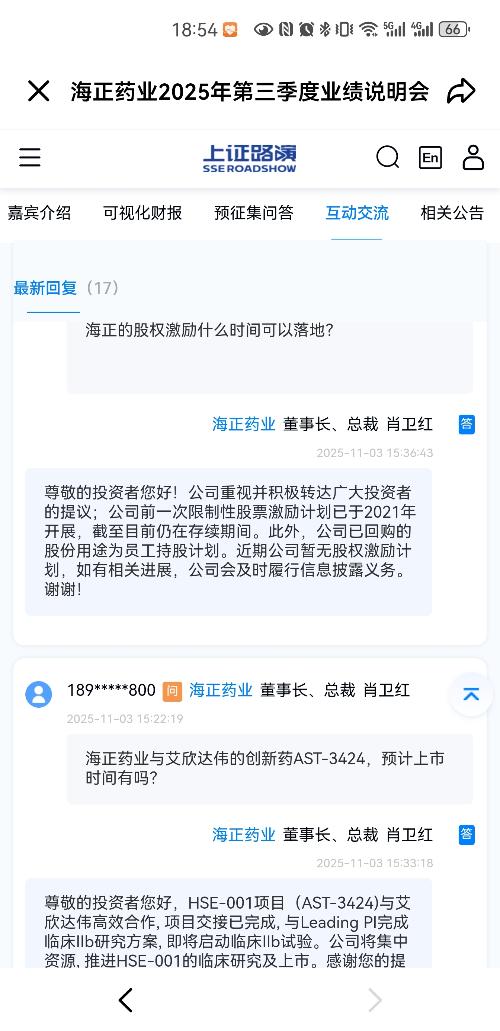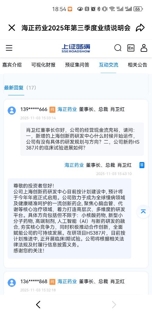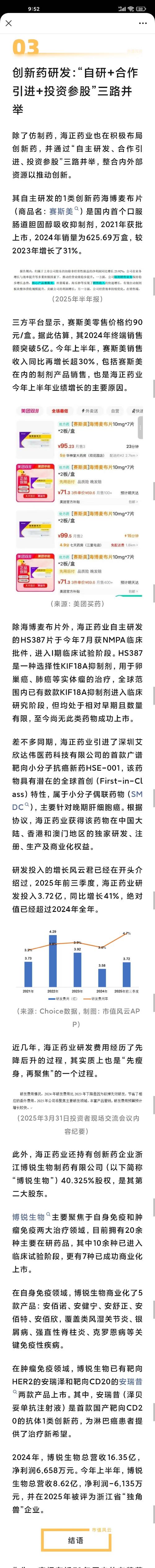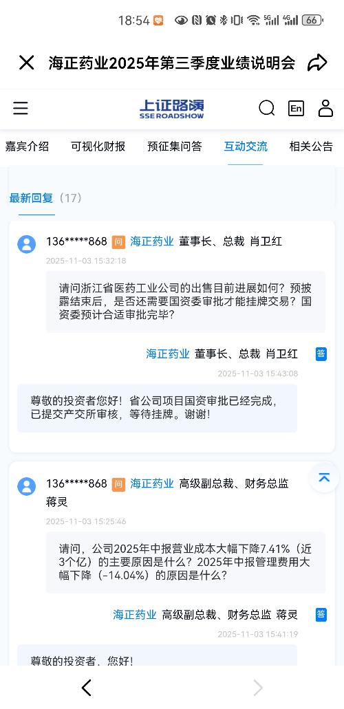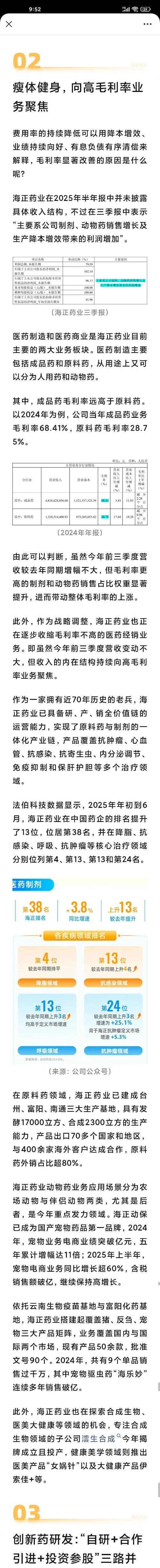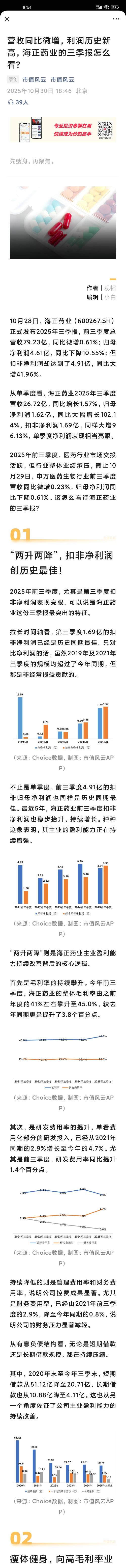 董事长点评三季报:转自。 我是海正药业董事长、总裁肖卫红,代表公司诚挚向大家问好,感谢大家一直以来对海正药业的关心、信任和支持! 今天参加本次业绩说明会的公司领导还有:高级副总裁兼财务总监蒋灵先生,独立董事周华俐女士,董事会秘书沈锡飞先生等公司领导及相关部门负责人。 2025前三季度,公司实现营业收入79.23亿元,归母净利润4.61亿元;单季度表现尤为亮眼,第三季度公司实现营业收入26.72亿元...