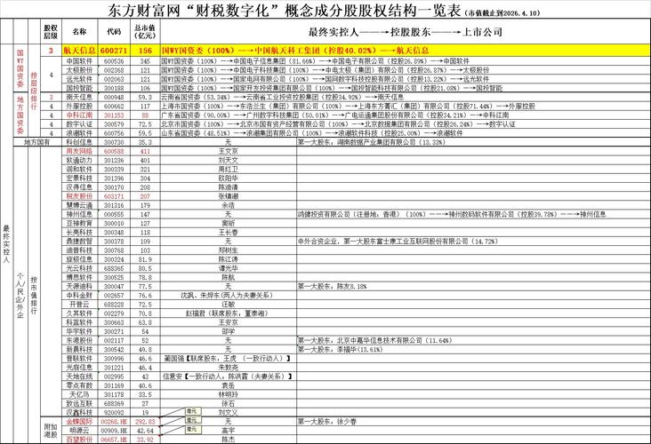 $航天信息(SH600271)$接上一篇帖子继续的话题,聊一聊东财的“财税数字化”概念共41家成份股的各自股权层级架构(见图片)。 注:为了更详细对比,表格最下附加3家港股,这3家非东财“财税数字化”概念的成份股,但也是属于“财税数字化”行业范畴,合计44家。 一、表格按最终实控人分为: GWY国资委(5家); 地方国资委(5家); 地方国有(1家); 个人/民企/港澳台、外资(33家); 二、最...