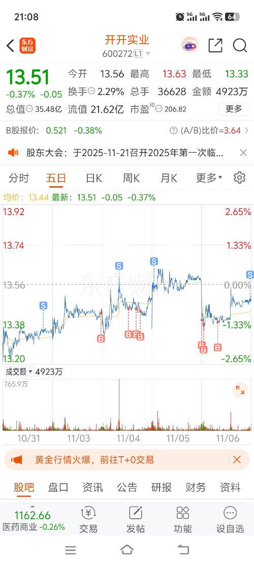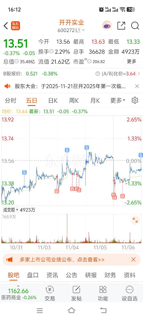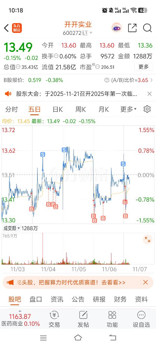 $开开实业(SH600272)$每分钟成交1笔2笔,玩个基尔