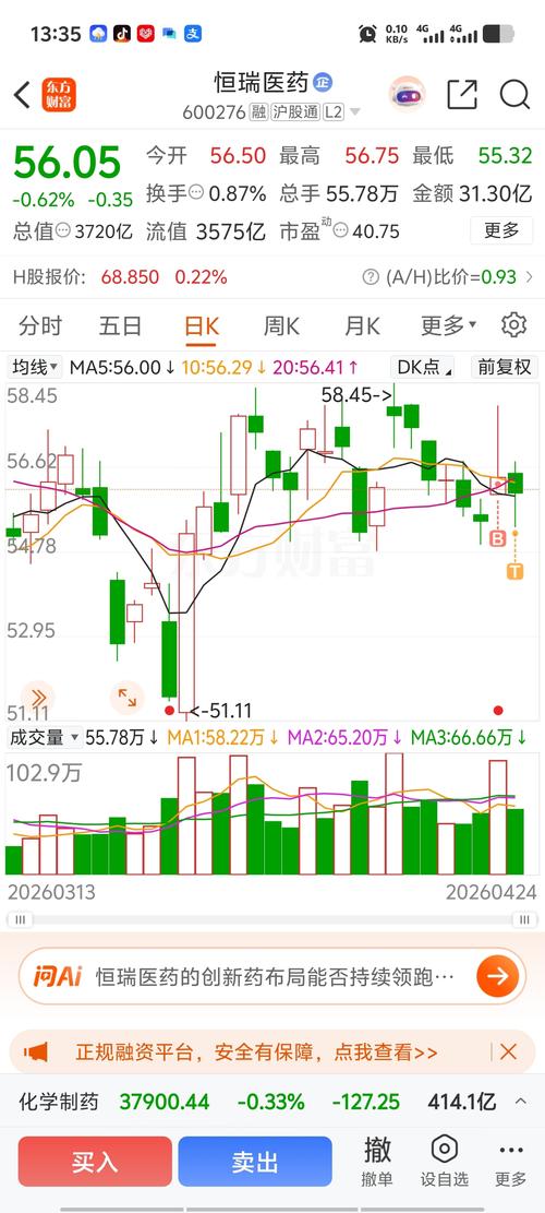 晚间话恒瑞医药:周五回顾与明日展望 周五回顾:早盘56.50元开,最高冲至56.75元,最低下探55.32元,最终收盘56.05元,下跌0.62%,单日振幅2.54%,全天运行区间55.32-56.75元。全天总手55.78万,成交额31.30亿,换手率0.87%,量比0.93,资金活跃度与前一交易日持平;委比-35.94%,卖盘力量稍占优,外盘成交26.68万,内盘成交29.10万。个股所属医药...