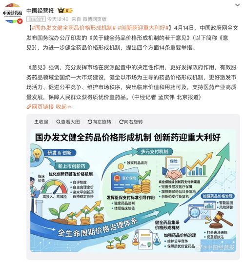4月14日,国务院办公厅发布《关于健全药品价格形成机制的若干意见》,这场医药圈期待已久的政策落地,带来了创新药领域最重磅的突破。意见明确对高水平创新药支持上市初期制定匹配高投入、高风险的价格,并给予一定时期的价格稳定,彻底终结了“上市即降价”的旧逻辑,标志着医药政策从单纯控费转向创新激励与精准保障并重,创新药的估值与盈利逻辑全面重塑。 新政的核心突破,在于建立了一套更科学更包容的定价体系。创新药不...