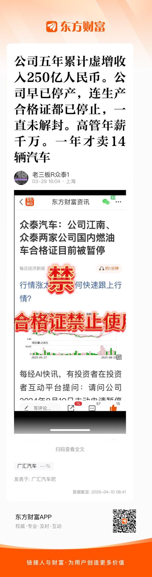 那么多钱不公告。招人是不是先要有生产机械设备先进场?没钱买设备了吧。事实胜于雄辩、胜于造谣……庞大虚假宣传央企接盘消息……从2019年至今,众泰已连续亏损6年,累计亏损高达250多亿元。在浙江证监局出具的警示函中,直指众泰披露的相关报告存在财务信息不准确问题。企业的信誉资本,与金融资本一样消耗殆尽。据知情人士透露...