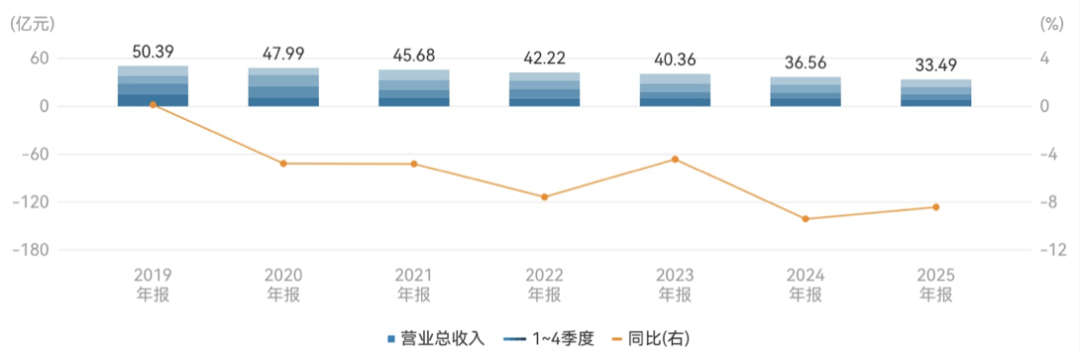 从2020年起,维维股份营收进入下行通道,至今已连续6年下滑。 从植物蛋白饮料龙头,到连续6年营收下滑,昔日“豆王”维维食品饮料股份有限公司(下称维维股份,600300.SH)正陷入规模增长与公司治理的双重困境。 维维股份日前发布的年度财务报告显示,公司2025年实现营业收入33.49亿元,同比下降8.42%;归母净利润为3.35亿元,同比下降18.63%。其中,...
