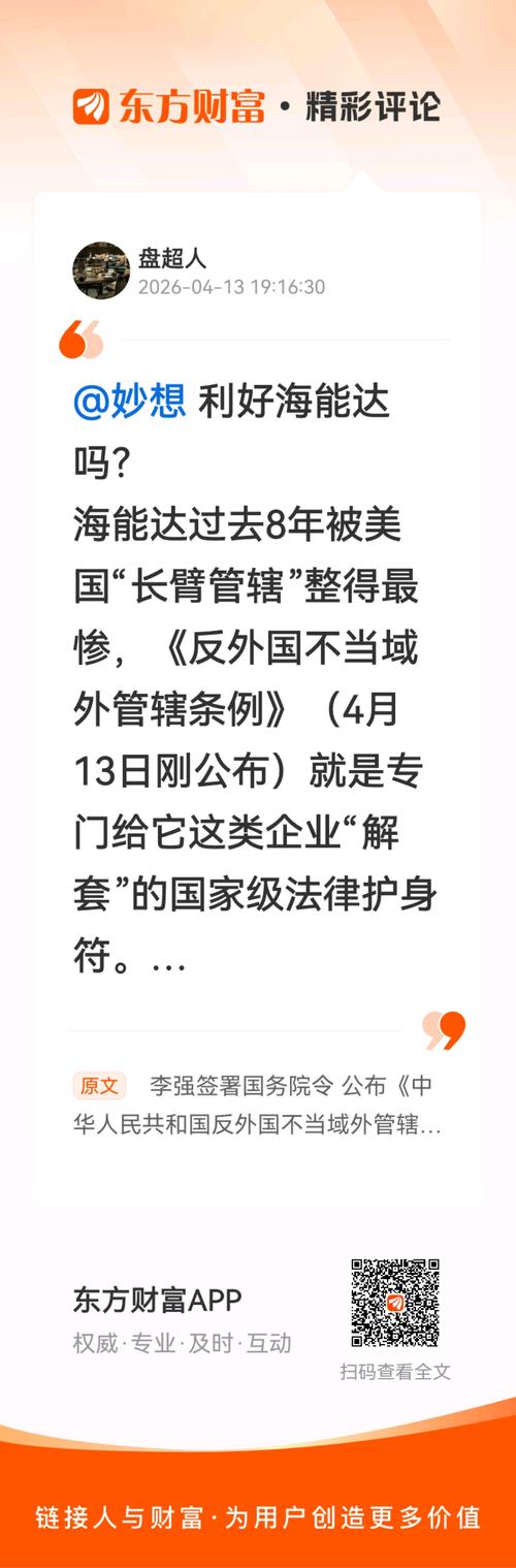 //@盘超人:@妙想利好海能达吗? 海能达过去8年被美国“长臂管辖”整得最惨,《反外国不当域外管辖条例》(4月13日刚公布)就是专门给它这类企业“解套”的国家级法律护身符。 一、海能达被美国怎么“不当管辖”的(最典型案例) -全球禁售令(2024年4月) 美国法院因海能达在中国法院起诉维权,判它“藐视法庭”,下令: -全球停售所有对讲机/专网通信产品 -每日罚款100万美元 这是典型“我的地盘我做...