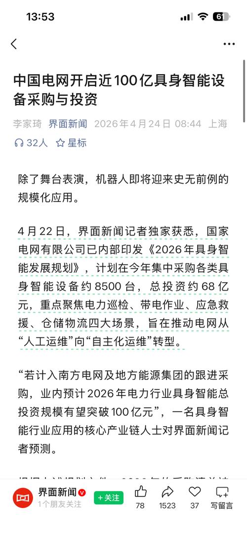 中国电网开启近100亿具身智能设备采购与投资机器人应用打开新空间 2026年04月24日08:36作者:李家琦来源:界面新闻148人评论99+99+99+ 炒股第一步,先开个股票账户 除了舞台表演,机器人即将迎来史无前例的规模化应用。 4月22日,界面新闻记者独家获悉,国家电网有限公司已内部印发《2026年具身智能发展规划》,计划在今年集中采购各类具身智能设备约8500台,总投资约68亿元,重点聚...