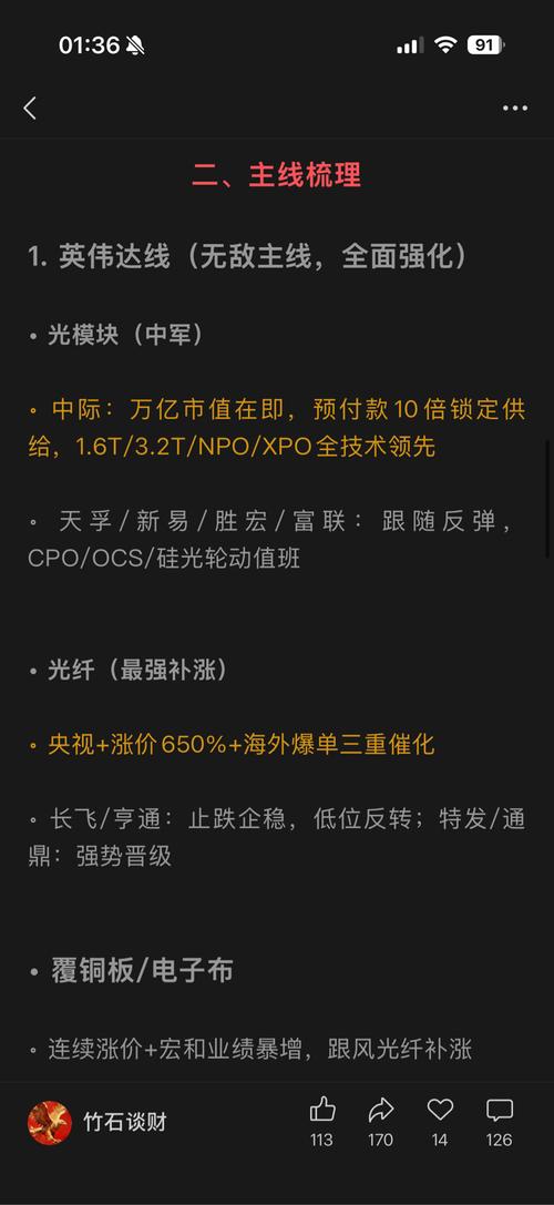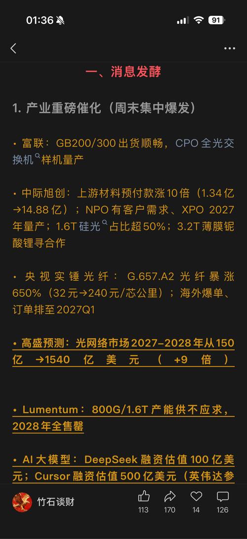 $三安光电(SH600703)$$亨通光电(SH600487)$$天通股份(SH600330)$ 一、消息发酵 1.产业重磅催化(周末集中爆发) •富联:GB200/300出货顺畅,CPO全光交换机样机量产 •中际旭创:上游材料预付款涨10倍(1.34亿→14.88亿);NPO有客户需求、XPO2027年量产;1.6T硅光占比超50%;3.2T薄膜铌酸锂寻合作 •央视实锤光纤:G.657.A2光纤...