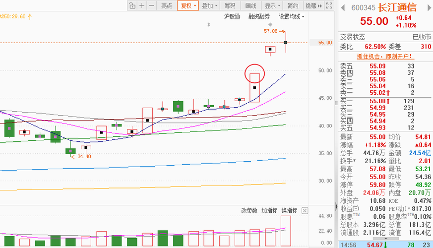 今日(4月13日),长江通信(600345)在连续暴涨后迎来剧烈震荡。截至收盘,股价报54.35元,微跌0.02%。看似平静的数字背后,却是一场惊心动魄的多空大战。 开盘即冲高至57.08元的日内高点,一度逼近涨停,但随即遭遇猛烈抛压,最低下探至53.21元。全天振幅超7%,成交额21.34亿元,换手率高达18.39%。这意味着,每5个持有该股的人中,就有近1人选择了离场。 暴涨回顾:10天狂涨3...