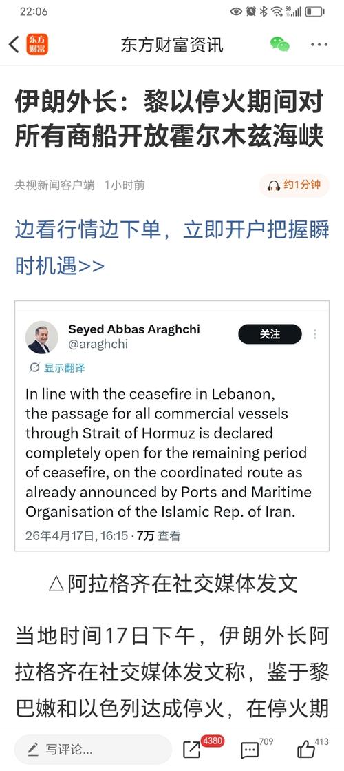 $恒力石化(SH600346)$21:15:28【特朗普确认伊朗开放霍尔木兹海峡】财联社4月17日电,美国总统特朗普17日说,感谢伊朗开放霍尔木兹海峡。特朗普在社交媒体上写道:“伊朗刚刚宣布,伊朗海峡已完全开放,可全面通行。谢谢!”(新华社)(来自财联社APP)