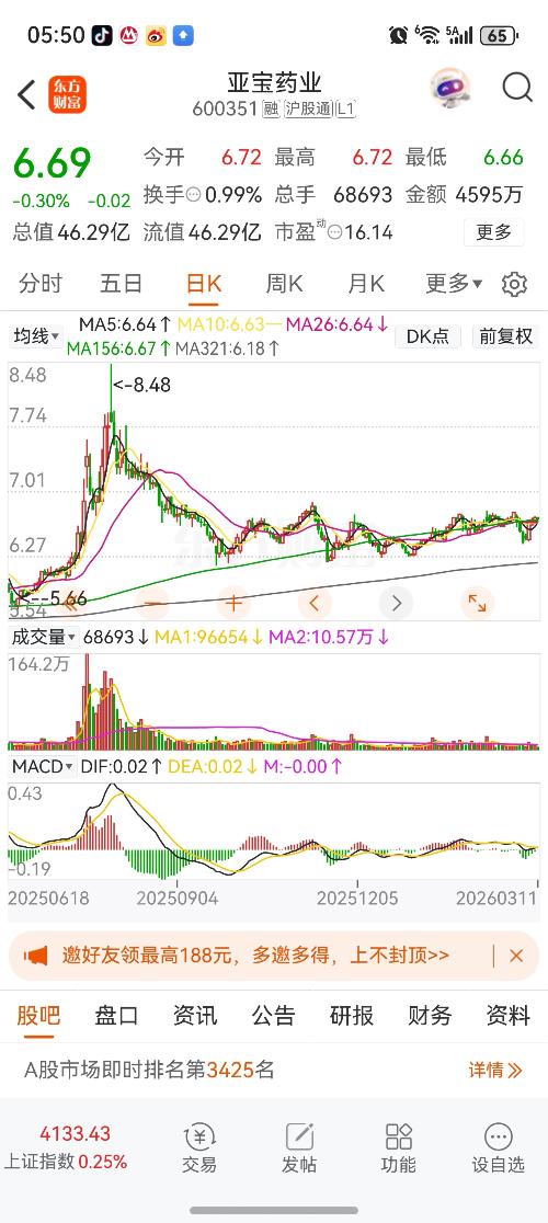 $亚宝药业(SH600351)$前天就提醒大家日KJ值100多在亚宝就没有不跌的时候,不听劝就只能乖乖当股东,忘了告诉你们,如果分红还跟去年一样每股分0.5元,拿着不动当耐心资本比存银行划算,不过今年按现状每股分0.5元不太现实