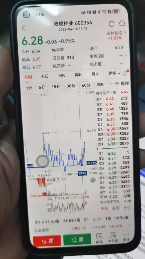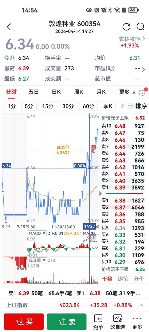 $敦煌种业(SH600354)$630没成交,后面6.34也等不到6.33水下,追高636。第一次买别让我失望,养殖大涨你得放量发力几天上7