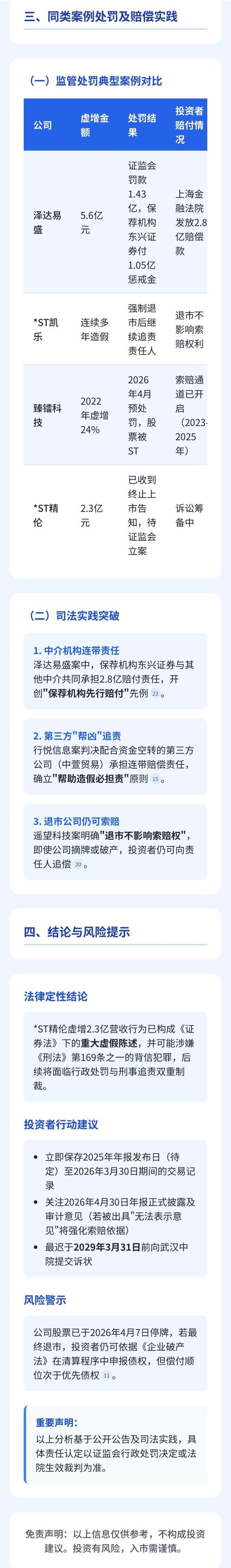 *ST精伦恶性欺诈典型案例,将成为A股市场出清“造假惯犯”的标志性事件。其退市已无悬念,而围绕其从上市之初到退市边缘的系列违法行为所展开的行政、刑事与民事追责,将构成一个完整的追责闭环,以此警示市场:财务造假的成本,终将由造假者以毁灭性的代价全额偿付!