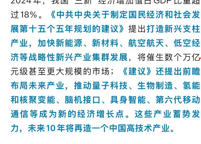 《建议》提出前瞻布局未来产业,推动量子科技、生物制造、氢能和核聚变能、脑机接口、具身智能、第六代移动通信等成为新的经济增长点,这些产业蓄势发力,未来10年将再造一个中国高技术产业。