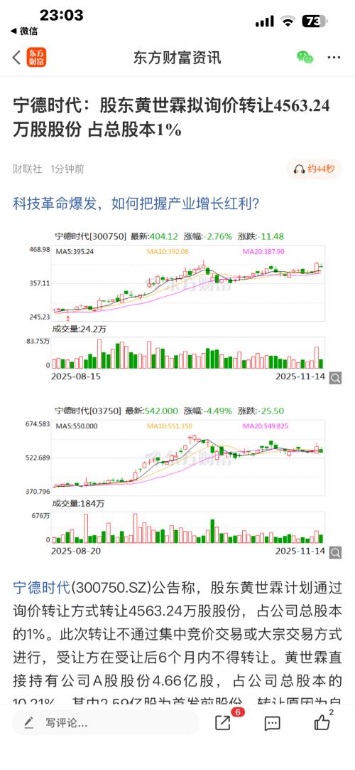 $联创光电(SH600363)$宁德时代(300750.SZ)公告称,股东黄世霖计划通过询价转让方式转让4563.24万股股份,占公司总股本的1%。此次转让不通过集中竞价交易或大宗交易方式进行,受让方在受让后6个月内不得转让。黄世霖直接持有公司A股股份4.66亿股,占公司总股本的10.21%,其中2.59亿股为首发前股份。转让原因为自身资金需求!是准备增持其他公司吗?