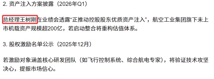 $中航机载(SH600372)$ 中航机载(600372.SH)的资产注入工作正在按计划推进,根据最新信息,关键时间节点和公布安排如下: 一、已公布的资产注入计划 1.航投誉华股权收购 -2025年12月12日,公司已正式公告拟以2.02亿元收购航空产业投资持有的航投誉华59.1816%合伙份额 -该交易涉及5家核心企业(南京伺服、翔腾微、无锡雷华、上海埃威、凯天电子)的间接注入,目前已通过董事会...