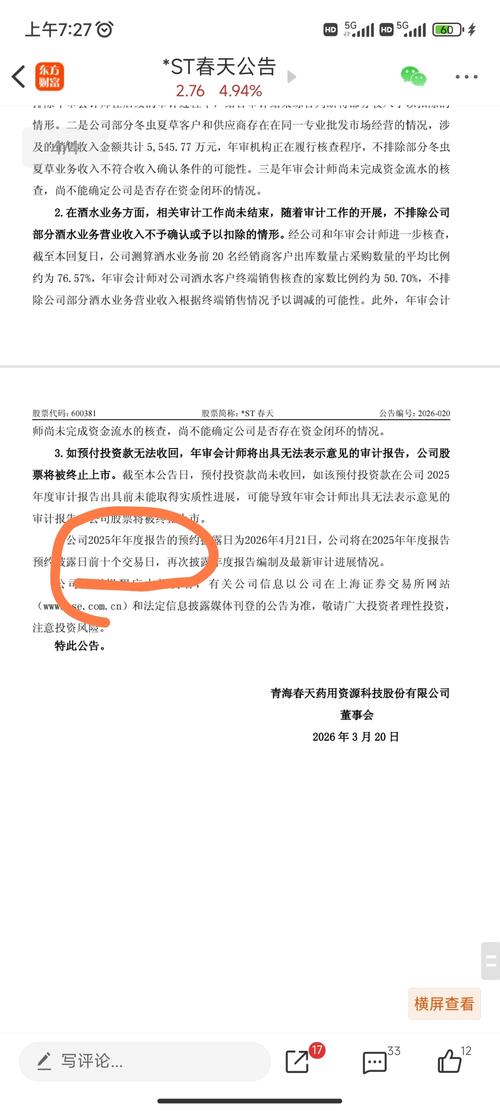 看到周五还是有很多恐慌盘卖出,我再给各位一点硬货,大家把握好: 你们认为审计师给的数据真实还是上市公司自己发的数据真实?我相信都应该是相信审计师的吧; 3月19日年报业绩预告函:第13页,年审会计师有个回复意见:冬虫夏草已经完成走访及终端销售核查的比例98.92%,这个数据是销售额。针对酒水和冬虫夏草要查资金流水,要确认资金是否有闭环,需要上市公司协调客户和供应商的银行资金流水, 3月21日,审计...