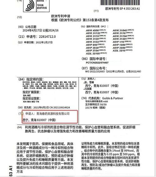 $*ST春天(SH600381)$青海春天(听花酒)的欧洲专利已通过。 关键信息 -专利名称:酒精和凉味剂的组合物在调节性功能、保护心脑血管系统、促进肝细胞再生、抗肿瘤、提高免疫及睡眠质量上的用途 -欧洲专利号:EP4353263 -申请时间:2022-01-27(申请号:22814712.0) -获批时间:2026-04-03(欧洲专利局授权) -覆盖范围:欧盟38个成员国 需要我帮你查一下该欧...