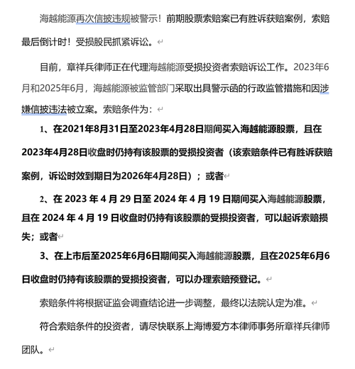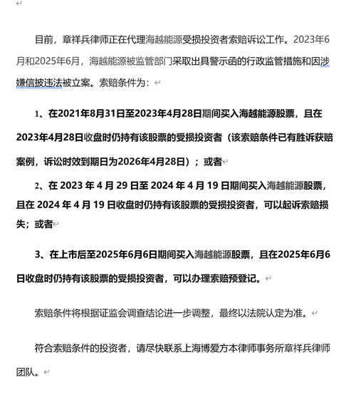受损投资者如何判断自己是否符合索赔条件?维权时间节点至关重要!谁有资格主张权利?符合以下情况的可参加索赔:符合以下任意一种情况的可参加索赔: 1、2021年8月31日至2023年4月28日之间买入600387海越能源,且在2023年4月29日(含当日)之后卖出或继续持有者 2、2023年4月29日至2024年4月19日之间买入600387海越能源,且在2024年4月20日(含当日)之后卖出或继续持...