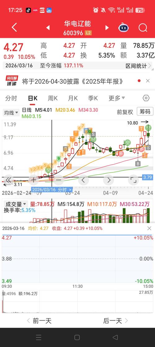晚间话华电辽能:周五回顾与明日展望 周五回顾:早盘9.65元开,最高冲至10.80元,最低下探9.11元,最终收盘9.20元,下跌6.41%,单日振幅17.19%,股价全天运行区间集中在9.11-10.80元。全天成交量435.6万手,成交额43.77亿,换手率29.58%,量比1.49,资金活跃度较前一交易日显著提升;委比15.21%,买盘力量稍占优势,内盘成交231.5万手,外盘成交204.1...