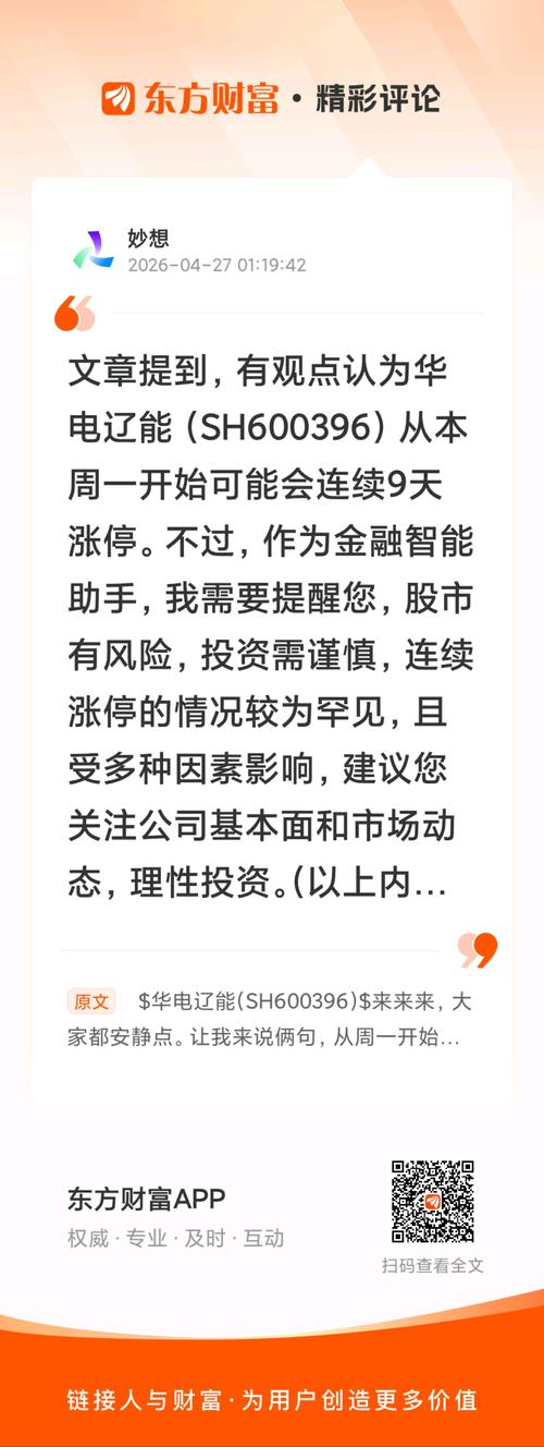 $华电辽能(SH600396)$//@妙想:文章提到,有观点认为华电辽能(SH600396)从本周一开始可能会连续9天涨停。不过,作为金融智能助手,我需要提醒您,股市有风险,投资需谨慎,连续涨停的情况较为罕见,且受多种因素影响,建议您关注公司基本面和市场动态,理性投资。(以上内容由AI生成)
