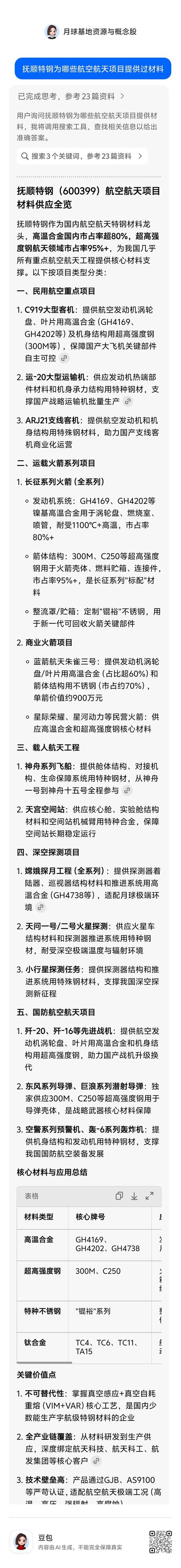 $抚顺特钢(SH600399)$豆包告诉我抚顺特钢之前参与了c919、空间站、嫦娥、天问等重大航空航天工程,我还问它,假设中国人在2040年前建立一个可同时容纳8000人的空间站,抚顺特钢的竞争力怎么样,它说抚顺的高温合金和超高强度钢的市场占有率在百分之八九十,抚顺还掌握-特种工艺:掌握真空感应+真空自耗重熔(VIM+VAR)双真空冶炼技术,是国内唯一能生产宇航级特钢的企业,产品通过GJB、AS9...