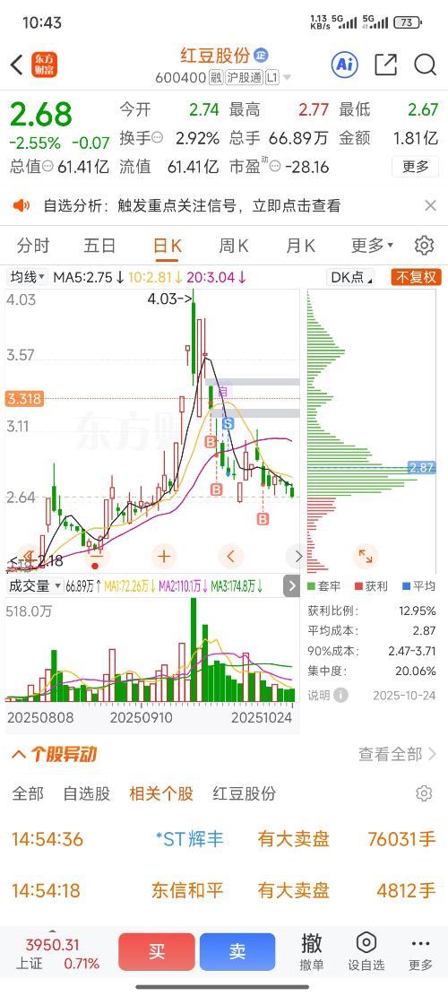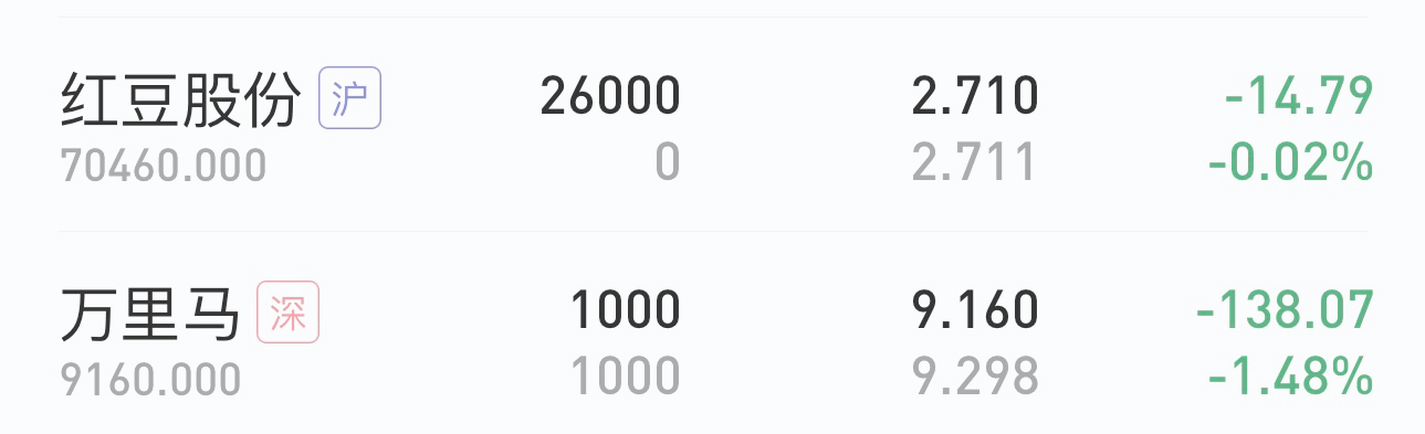 $万里马(SZ300591)$悟道第三天,万里马经过底部充分换手后,今天主力进场吃筹,及时出掉补仓资金防止主力再次洗盘时有资金补仓,目前万里马亏1.48%个点,保留底仓即可,今日早盘新进$红豆股份(SH600400)$,红豆明显跌不下去了,下方承接太强,明显是有大资金护盘,快调整快到位了,2成左右仓位进场博弈暴利大反弹,看看能否吃到肉(2025年10月24日早盘) 免责说明: 仅记录分享个人操作,...