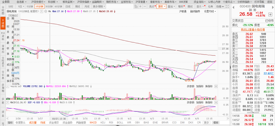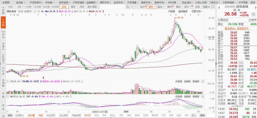 晚间话国电南瑞:今日回顾与明日展望 今日回顾 早盘26.00元开,最高冲至26.61元,最低下探26.00元,最终收盘26.58元,上涨4.07%,单日振幅2.39%,股价全天运行区间集中在26.00-26.61元。全天成交量83.30万手,成交额22.02亿,换手率1.04%,量比1.46,资金活跃度较前一交易日有所提升;委比-29.12%,卖盘力量稍占优势,内盘成交40.51万手,外盘成交42...