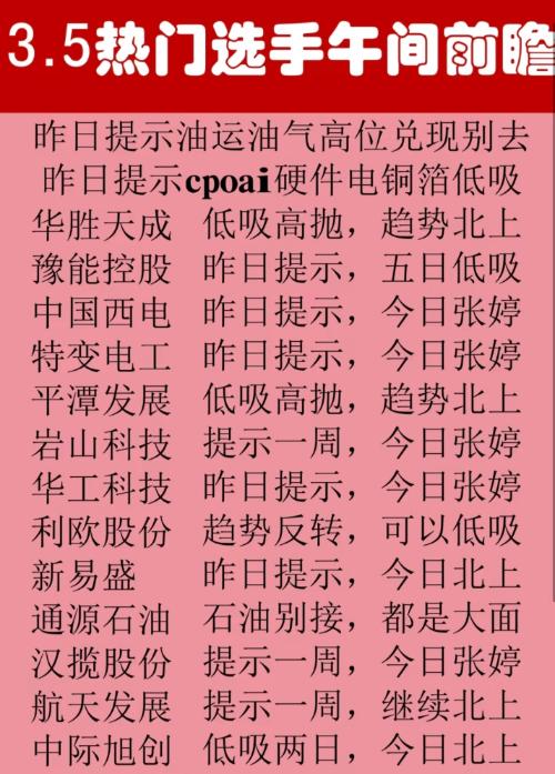 核心是:电力/电网、CPO/AI硬件、低位科技强势,油气油运建议高位兑现。 一、重点提示方向 1.规避/兑现 -油运、油气:提示高位兑现,不要接 -通源石油:明确提示“别接,大面风险” 2.低吸主线 -CPO、AI硬件、电、铜箔:提示低吸 -$华胜天成(SH600410)$、平潭发展:低吸高抛,趋势向上 -利欧股份:趋势反转,可低吸 -中际旭创:低吸两日,今日走强 3.昨日/前期提示,今日涨停/大...