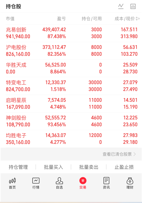 老铁们,收盘了!我是老张。 今天大盘表现给力,上证收在4106点,上涨0.5%,深证和创业板涨幅都超1%。咱们手上的个股表现也很亮眼:华胜天成走出深V反转,最低27.14一路拉到28.73,收涨2.9%;巨力索具盘中冲高到21.31,收盘20.15,我在20.43加仓600股;汉缆股份在8.89加仓500股。其余个股红多绿少,账户整体继续增值。 再跟早评计划对一下:早评提示华胜关注27.5-27....