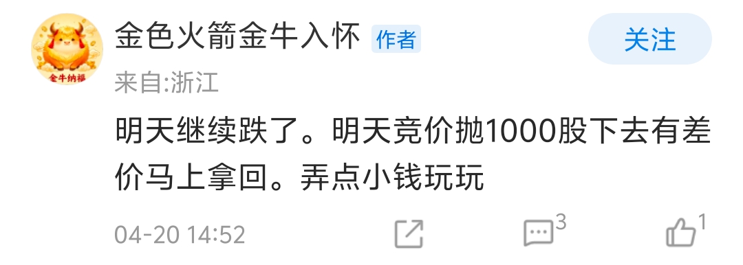 金色老头说今天竞价卖1000股,不知道卖了没有,如果没卖,那就是坏,如果卖了,那就是蠢,老头从来没说对过