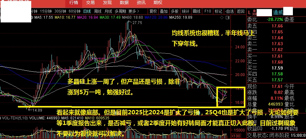 目前2025加大亏损,2026减亏是可能的。你想一下就赚钱了难,必然2025年下半年多晶硅期货3万——6万,所以导致股价大反弹一倍,被套者有增多了。因为散户增加了。2025还是加大亏损,看来想快速好转很难的。