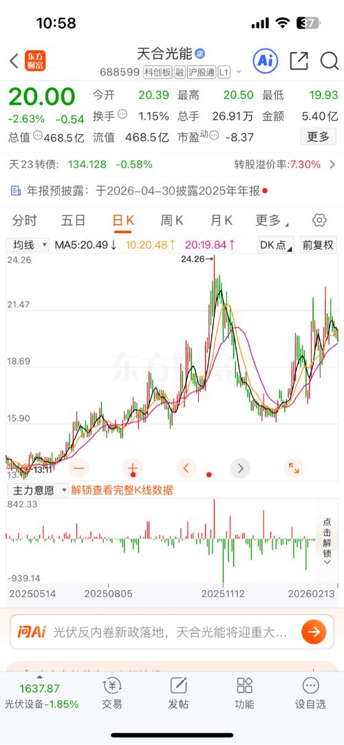 光伏板块里,目前有个非常奇特的现象,通威股份和大全能源两支一路受20天线压制趋势“不断向下”,而晶科能源和天合光能“趋势是向上走