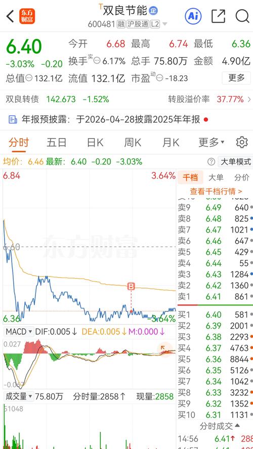 (个人观点仅供参考,不构成任何投资建议,投资有风险,入市需谨慎) 今日走势概览 双良节能今日收报6.40元,跌幅3.03%,换手率3.67%,成交量75.8万手,成交额4.90亿元,整体呈现高开低走、震荡走弱的走势,早盘高开后快速跳水,随后全天在低位弱势运行,尾盘小幅收窄跌幅,走势弱于大盘及新能源板块平均水平,属于板块内的弱势标的。 资金与盘口分析 主力资金方面,全天呈现明显的净流出态势,早盘高开...