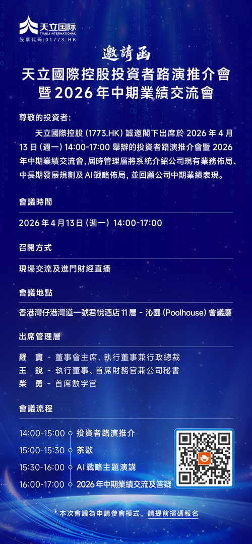 尊敬的股东及投资人, 天立国际控股(1773.HK)诚邀您参加即将在2026年4月13日(周一)下午14点召开的投资者路演推介会暨2026年中期业绩交流会,您可根据自身会议流程需求,参照以下邀请函指引报名参会(线上/线下均可)。 期待您的参与。