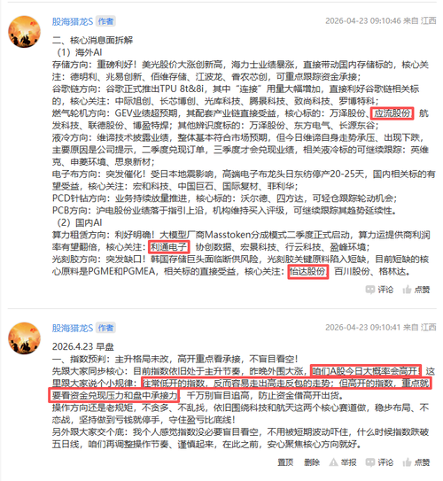 势起则动,势竭则离,这就是猎手之道。 今日市场整体高位震荡整理,结束5连阳。可关注以下因素:4月底年报一季报密集披露期,部分题材股存在业绩兑现压力;此前连续上涨后存在短期获利了结需求;外部市场波动也对情绪产生一定影响。 热点板块解读: 中船系:今日表现相对强势。行业层面有政策支持,部分船企公告大额订单,全球造船周期上行带来需求增长。 白酒:在市场波动期,白酒板块业绩稳定性相对突出,部分龙头企业分红...