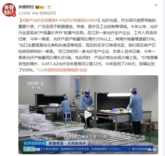 $亨通光电(SH600487)$ 国产光纤全球爆单部分产品价格暴涨650% 央视财经昨天22:51157评论1/1权威精选6.92万人订阅订阅3分钟便捷开户,多重炒股工具限时体验>> 今年以来,光纤行业呈现出“产品量价齐升”的景气态势。在江苏一家光纤生产企业,工作人员告诉记者,今年一季度,光纤产品产销量同比增长35%以上,其海外销量增速超55%。“出口主要是面向北美和东南亚等地区,现在的在手订单很...