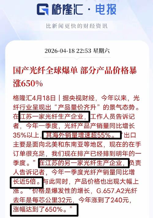 2026年4月18号的中央电视台:经济信息联播 亨通光电订单排产到2027年年一季度,光纤全品类都是24小时满负荷生产 光纤行业量、价齐升 以前是先发货再给钱,现在的光纤一般先给钱再发货 人工智能的数据中心对光纤需求比传统电信增长5--10倍 光纤涨价大约是4--6倍,涨价周期从2025年12月到2026年3月 光纤是人工智能的通路,ocs、cpo、光模块都需要光纤 光纤生产的扩产周期需要18--...