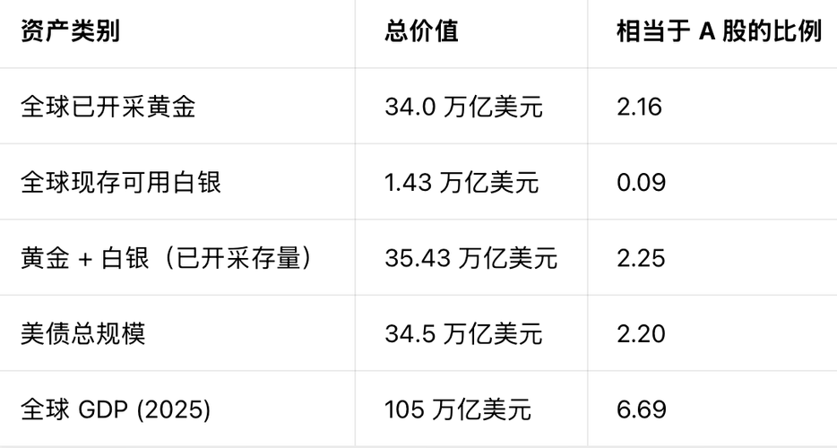 当我们谈论全球财富时,黄金与白银这两种古老的贵金属始终占据着特殊地位。它们既是历史上的货币载体,也是现代金融体系中的重要资产。但你知道吗?人类数千年开采积累的所有黄金白银总价值,远超很多人的想象,折算下来大约相当于2.25个A股市场。今天,我们就用精准数据,揭开这个财富谜题的真相。 一、全球已开采黄金:21.6万吨的"终极财富池" 世界黄金协会2026年初最新数据显示,人类有史以来累计开采的黄金总...