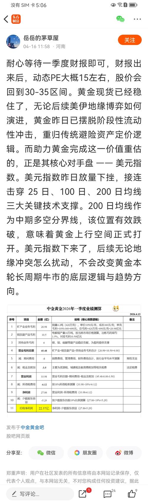 我记得23年中金黄金高的时候,市盈率三十左右,现在中金黄金涨了这么多,市盈率反而降了业绩才是关键,这是本质$中金黄金(SH600489)$$山东黄金(SH600547)$