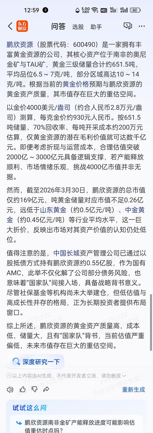 截至2026年初,鹏欣资源(股票代码:600490)在黄金、铜、钴等关键矿产资源方面拥有较丰富的储量,并具备一定规模的产能。以下是基于权威财经平台和公司公告整理的核心数据: 一、资源储量(权益口径) 黄金资源量 总资源量:约693.14吨(探明+控制+推断三级储量)南非奥尼金矿:约450吨南非Tau矿:约243.14吨平均品位:6–7克/吨,局部区域达10–14克/吨远景潜力:含未完全探明资源后,...