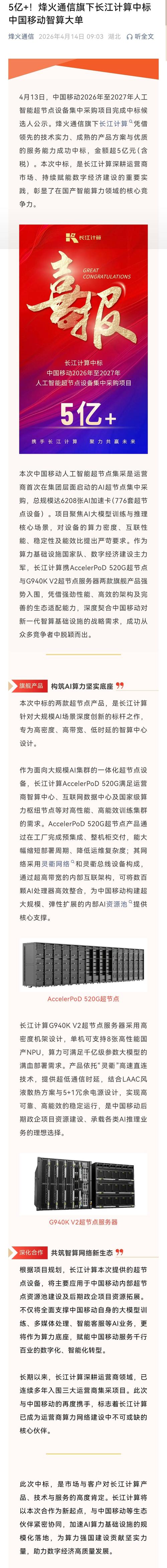 资讯 烽火通信旗下长江计算中标中国移动智算大单 金额超5亿元