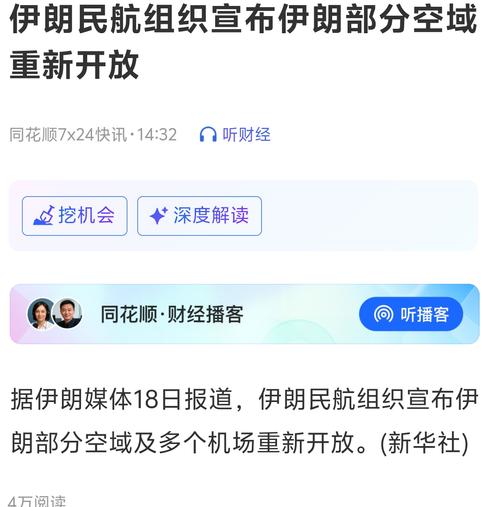 据央视新闻,伊朗民航组织表示,从当地时间今天(4月18日)上午7时,也就是北京时间上午11时30分起,已重新开放其部分领空及多个机场。该机构称,伊朗东部的空中航线已恢复,允许国际航班飞越伊朗领空。
