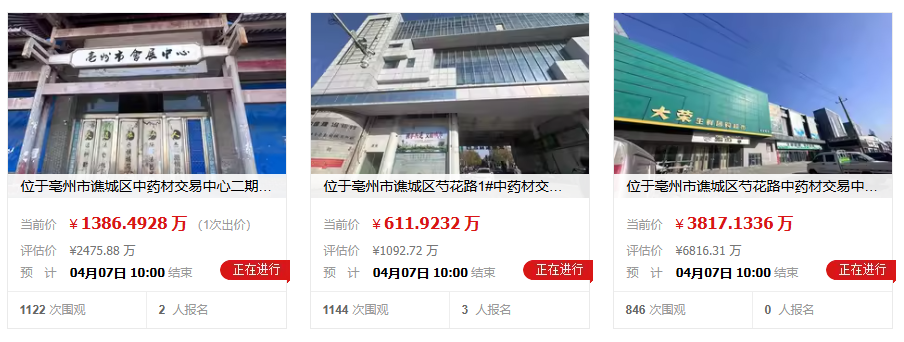 明天重点关注渤海信托案“(2025)粤52执恢65号执行裁定书”4月6日二拍开始!4月7日结束 情况如下: 位于亳州市谯城区中药材交易中心二期工程内的不动产[权属证号:亳国用(2012)第01005号,亳字第201409865号]2人报名,已经出价(淘宝网拍卖如图) 位于亳州市谯城区芍花路1#中药材交易中心的不动产【权属证号:皖(2018)亳州市不动产权第0041959号】3人报名,暂时没有人出价...