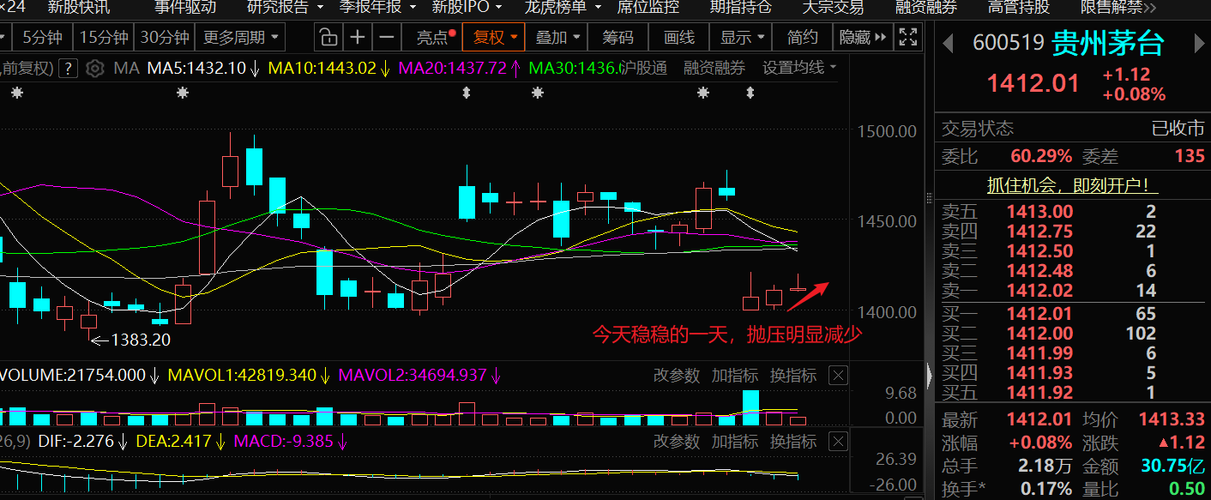 兄弟姐妹们晚上好!我是南山! (本帖子仅南山个人实盘记录,不构成任何投资建议) $贵州茅台(SH600519)$">$贵州茅台(SH600519)$ 今天走得四平八稳,抛压比前几天小多了,底部在一点点夯实。中线看的是方向和质地,给它点时间慢慢来就行。 今天茅子走得比较稳,小幅震荡上行,收盘1412.01元,涨了0.08%,换手率0.17%。上次披露的双降的年报带来的这个利空确实需要时间来消化,但从...