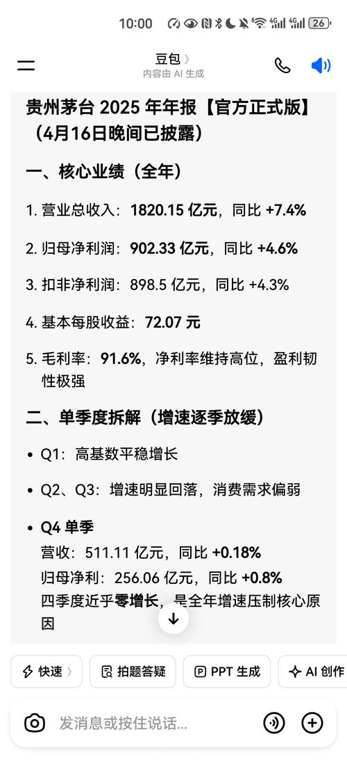 一、核心业绩数据(2025年报) 营业总收入:1,820.15亿元,同比增长7.4% 归母净利润:902.33亿元,同比增长4.6% 第四季度(Q4)单季: 营收:511.11亿元,同比增长0.18%(接近零增长) 净利:256.06亿元,同比增长0.8% 利润分配:每股派发现金红利28.8元,合计派现约360亿元,分红率79.8%
