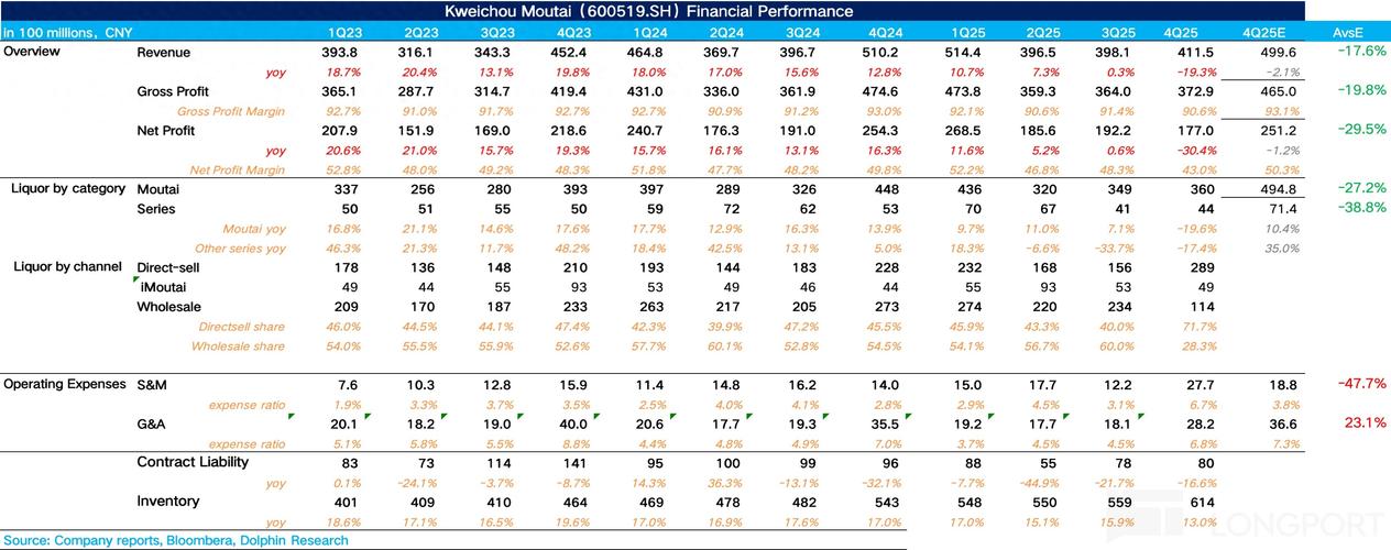 北京时间4月16日晚间,“消费一哥”贵州茅台(600519.SH)发布了2025年Q4业绩,表现不及市场预期,核心要点如下:$贵州茅台(600519.SH) 1、整体业绩负增长:四季度茅台共实现营收412亿元,同比下降19.3%。从节奏上看,四季度作为传统意义上的白酒消费旺季(中秋&国庆)、叠加经销商冲任务、春节前置备货等因素,一般是全年收入占比最多的节点,而今年四季度反而成为了茅台表现最弱的一个...