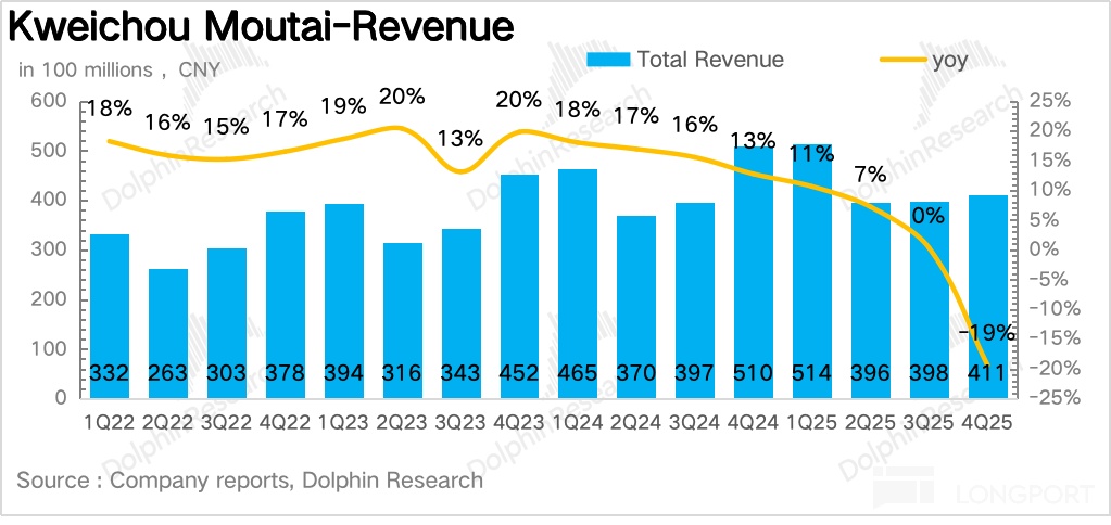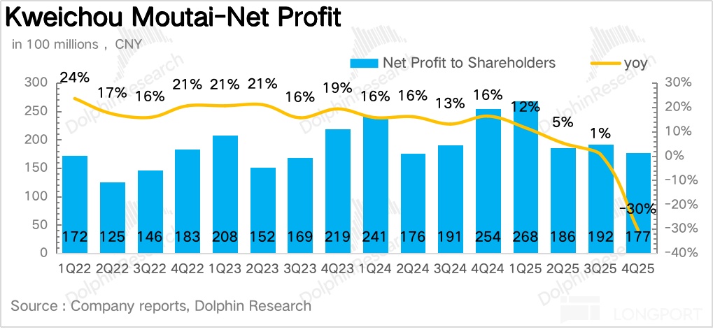 贵州茅台2025年年报今天刷屏了,数据很扎眼:营收1688.38亿元,微降1.21%;归母净利润823.2亿元,下滑4.53%,这是茅台2001年上市以来,第一次营收和净利双双负增长。 不少朋友第一反应是:“完了,白酒不行了。”甚至有人调侃:白酒年线连跌6年,连囤酒的黄牛都开始叫苦了。但作为我们不妨冷静下来,问一个更本质的问题:这到底是一次偶然的“触礁”,还是一个大周期走到拐点的必然结果? 一、3...