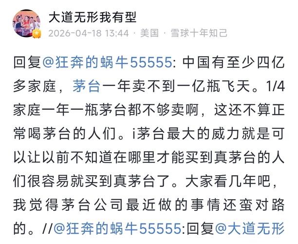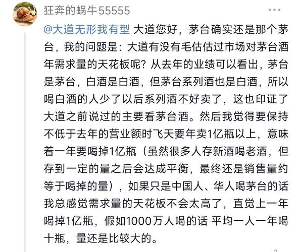 网友:大道您好,茅台确实还是那个茅台,我的问题是:大道有没有毛估估过市场对茅台酒年需求量的天花板呢?从去年的业绩可以看出,茅台是茅台,白酒是白酒,但茅台系列酒也是白酒,所以喝白酒的人少了以后系列酒不好卖了,这也印证了大道之前说过的主要看茅台酒。然后我觉得要保持不低于去年的营业额时飞天要年卖1亿瓶以上,意味着一年要喝掉1亿瓶(虽然很多人存新酒喝老酒,但存到一定的量之后会达成平衡,最终还是销售量约等于...