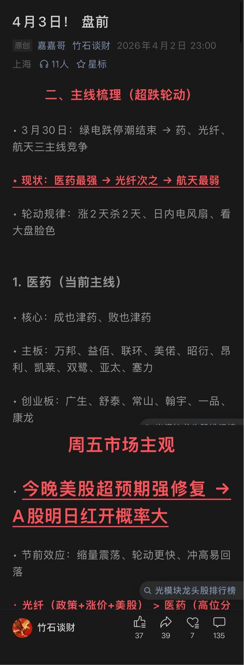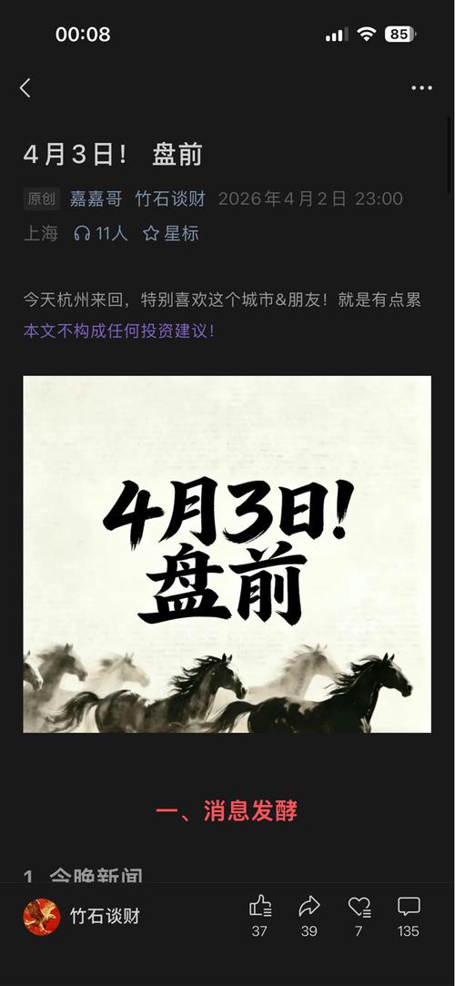 大家好我是老白,先关注点赞评论,留下你的评论一起在评论区探讨,这是对老白更新最大的动力。 大盘消息面 昨日A股上演“普跌戏码”,三大股指全线低开低走、冲高回落,沪指险守3900关键支撑位,深成指守住13400整数关口,创业板指领跌,属于健康的缩量回调,绝非趋势反转,截止4月2日收盘,沪指跌0.74%报3919.29点,深成指跌1.60%报13486.94点,创业板指跌2.31%报3172.65点,...