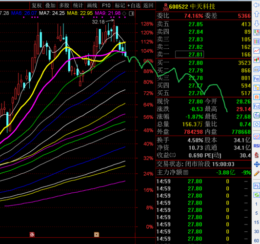 晚间话中天科技:今日回顾与明日展望 今日回顾:早盘28.26元开,最高冲至29.14元,最低下探27.68元,最终收盘27.80元,下跌0.53元,跌幅1.87%,单日振幅5.15%,股价全天运行区间集中在27.68-29.14元。全天成交量156.3万手,成交额44.30亿,换手率4.58%,量比0.74,资金活跃度较前一交易日有所回落;委比74.16%,买盘力量稍占优势,内盘成交86.17万手...