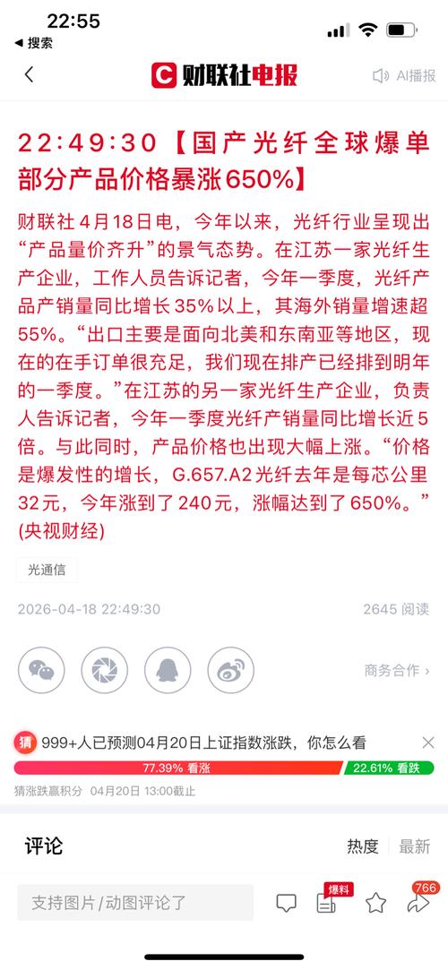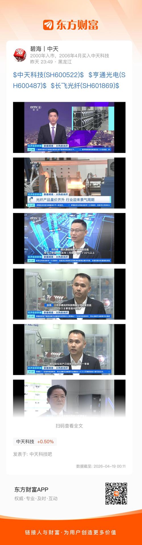 $中天科技(SH600522)$国产光纤全球爆单部分产品价格暴涨650% 04-1822:49星期六 央视财经 【国产光纤全球爆单部分产品价格暴涨650%】财联社4月18日电,今年以来,光纤行业呈现出“产品量价齐升”的景气态势。在江苏一家光纤生产企业,工作人员告诉记者,今年一季度,光纤产品产销量同比增长35%以上,其海外销量增速超55%。“出口主要是面向北美和东南亚等地区,现在的在手订单很充足,我...